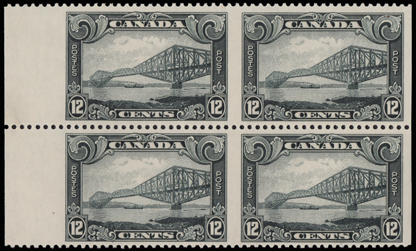 8888 nhbl 156 image1929, 12¢ Quebec Bridge (Scott 156), an exceptional Plate No. 2 block of 6, o.g., never hinged, fresh and mathematically centered; slight separation in several, otherwise Extremely Fine.