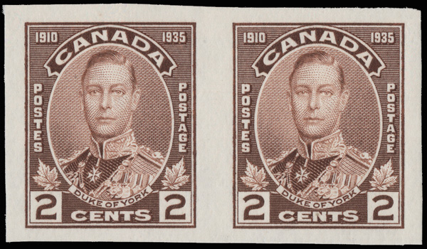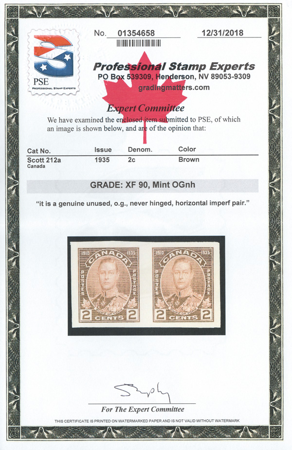 8920 nh 212a image1935, 2¢ Duke of York, imperf (Scott 212a), an outstanding horizontal pair, o.g., never hinged, post office fresh with large margins, Extremely Fine. Only 100 pairs were available., with a 2018 P.S.E. certificate graded XF 90.