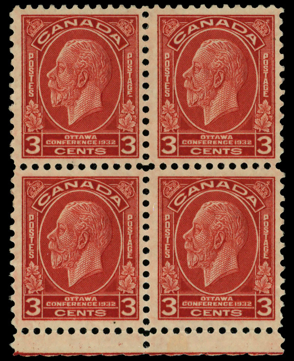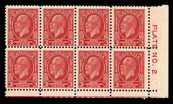 8909 nhbl 192 image1932, 3¢ Ottawa Conference, broken 'E' in 'POSTAGE', plate block of 8, o.g., never hinged, Fine to Very Fine.