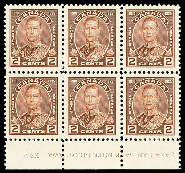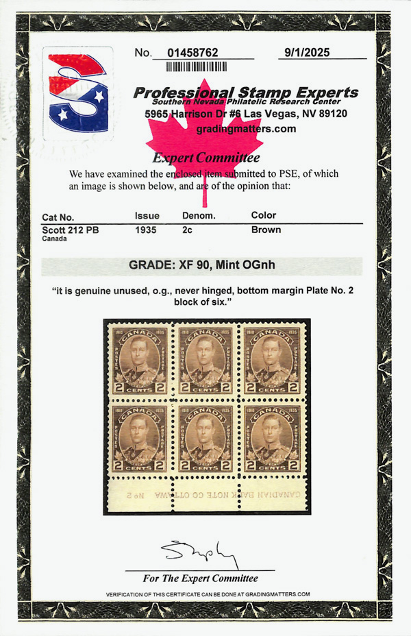8919 nhbl 212 image1935, 2¢ Duke of York (Scott 212), bottom margin plate No. 2 block of 6 with imprint, o.g., never hinged, sound and beautifully centered on bright white paper, Extremely Fine, with 2025 P.S.E. certificate graded XF 90.
