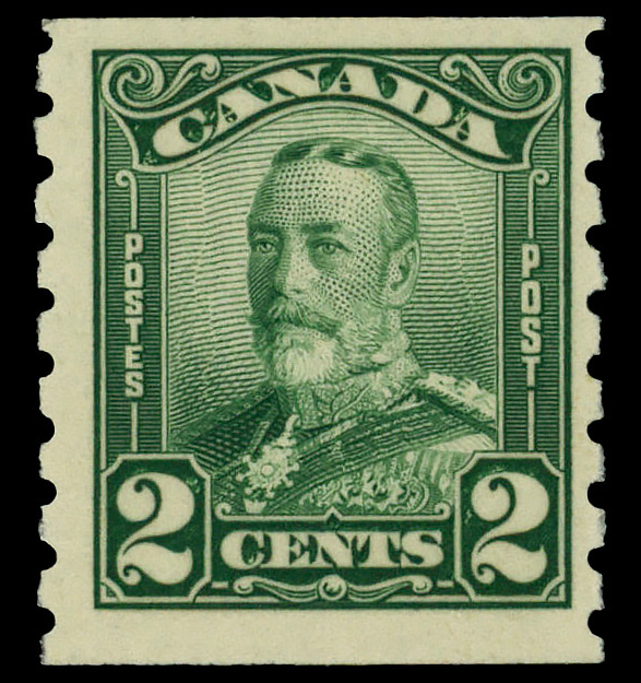 8896 nh 161 image1929, King George V "Scroll", 2¢ green, horizontal coil, perf. 8 vertically (Scott 161), o.g., never hinged, Fine to Very Fine.