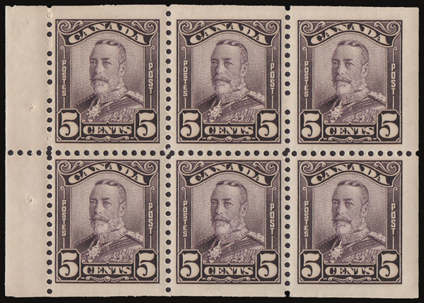 8884 BKnh 153a image1928, King George V "Scroll", 5¢ deep violet, booklet pane of 6 (Scott 153a), a choice, exceptionally well centered pane, o.g., never hinged, post office fresh and solid, Extremely Fine.