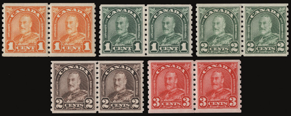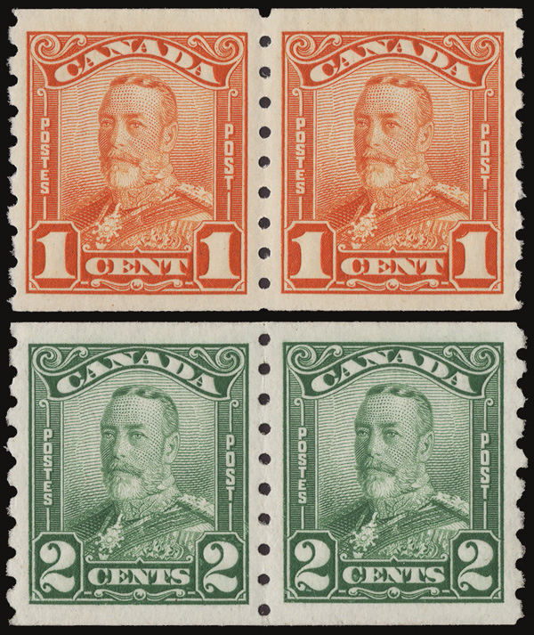 8895 nh 160-161 image1929, King George V "Scroll", 1¢ & 2¢ horizontal coils, perf. 8 vertically (Scott 160-161), an exceptional set of pairs, o.g., never hinged, fresh and incredibly well centered, Extremely Fine to Superb.