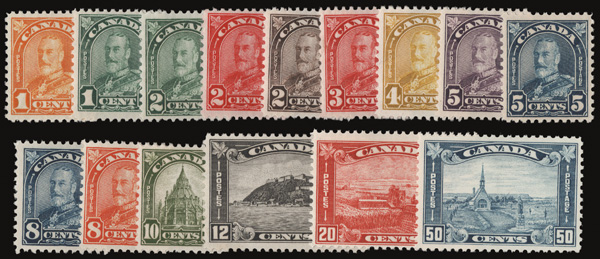 8897 nh 162-177 image1930-31, King George V "Maple Leaf" definitives, 1¢ to $1 complete (Scott 162-177), a fresh mint set, o.g., never hinged, Fine to Very Fine.