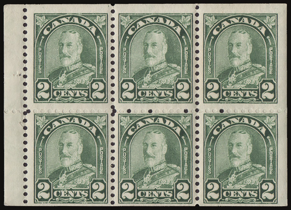 8898 BKnh 164a var. image1930, King George V "Maple Leaf", 2¢ dull green, booklet pane of 6 (Scott 164a var.), o.g., never hinged, fresh and solid, Fine to Very Fine and scarce.