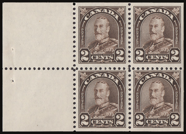 8899 BKnh 166a image1931, King George V "Maple Leaf", 2¢ dark brown, type II, booklet pane of 4 + 2 labels (Scott 166a), o.g., never hinged, exceptionally fresh and well centered, Extremely Fine. An xl pane.