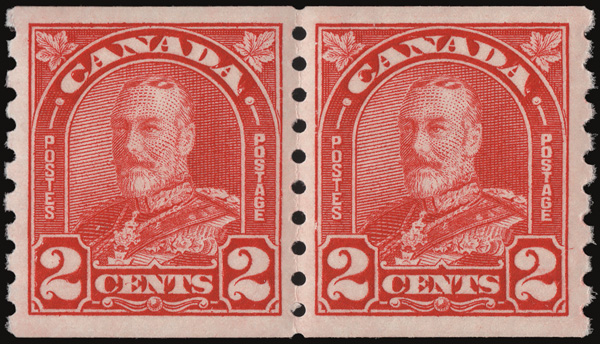 8894 nh 160 image1929, King George V "Scroll", 1¢ orange, horizontal coil, perf. 8 vertically (Scott 160), an extraordinary paste-up pair, o.g., never hinged, post office fresh and absolutely perfectly centered, Superb. A true Gem!