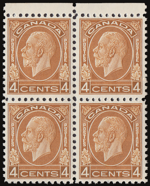 8913 nhbl 198 image1932, King George V "Medallion", 4¢ ocher (Scott 198), a choice block of 4, o.g., never hinged, post office fresh and and virtually perfectly centered, Extremely Fine.