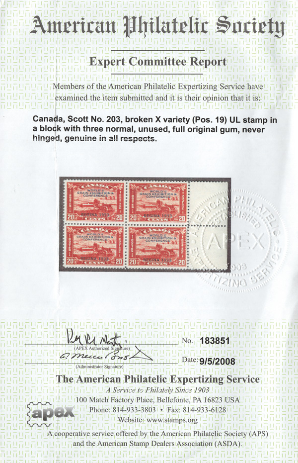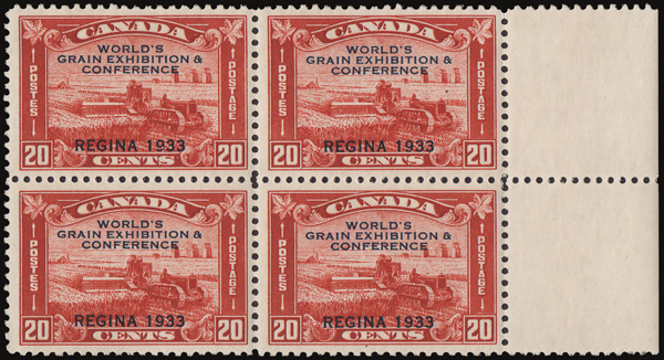 8917 nhbl 203 image1933, 20¢ Grain Exhibition, broken "X" in "Exhibition" variety (Scott 203 var.), the lower left stamp in a right sheet margin block of 4, o.g., never hinged, Fine to Very Fine, with a 2008 A.P.E.X. certificate.