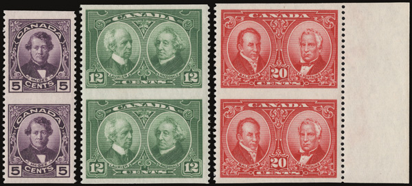 8881 nh/og 146c-148c image1927, Historical Issue complete, vertical pairs, imperf. horizontally (Scott 146c-148c), o.g., 5¢ never hinged, others lightly hinged, fresh and well centered, Very Fine.