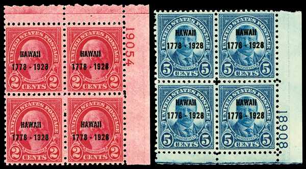 8225 nhbl 647-648 image1928, Hawaii complete (Scott 647-648), set of 2, plate blocks of 4, o.g., never hinged, Very Fine to Extremely Fine.