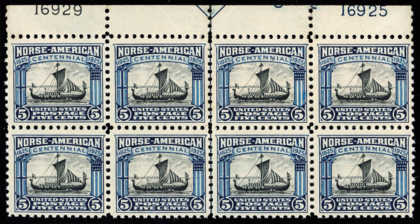 8216 nhbl 621 image1925, 5¢ Norse-American (Scott 621), top margin plate number 16929 - F16925 block of 8, o.g., never hinged, clean with attractive color and centering; sealed separations in selvage only, Fine to Very Fine.