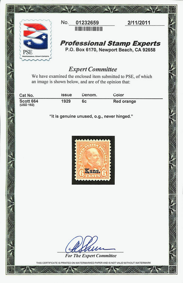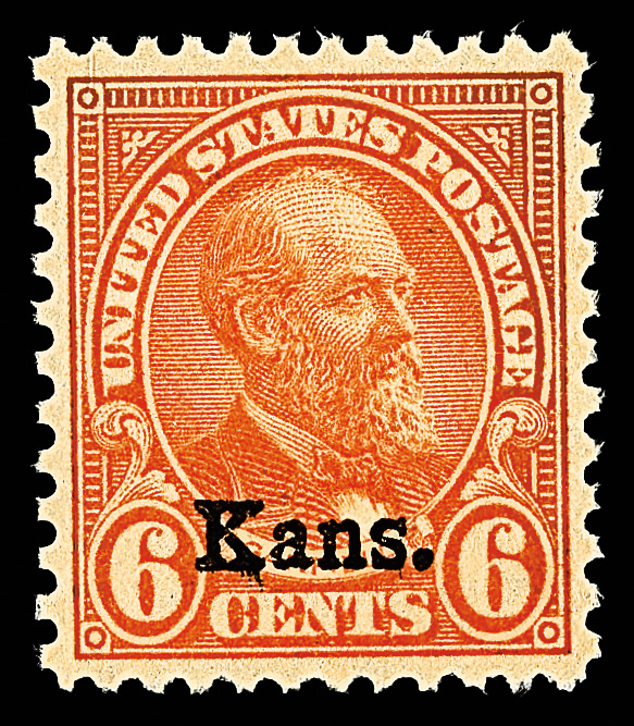8236 nh 664 image1929, 6¢ Kans. (Scott 664), broad borders, sharp strike, o.g., never hinged, Extremely Fine to Superb, with 2011 P.S.E. certificate.