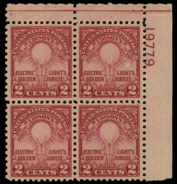 8228 nhbl 655 image1929, 2¢ Edison, rotary press printing (Scott 655), top right plate block of 4, WOW! look at that top right stamp, o.g., never hinged, Very Fine.