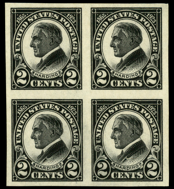 8211 nhbl 611 image1923, 2¢ Harding, imperf. (Scott 611), block of 4, o.g., never hinged, Extremely Fine.
