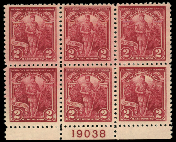8223 nhbl 643 image1927, 2¢ Vermont (Scott 643), plate block of 6, o.g., never hinged, Very Fine to Extremely Fine.