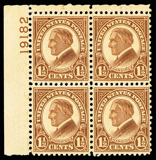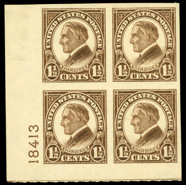 8220 nhbl 631 image1926, 1½¢ Harding, rotary press printing, imperf. (Scott 631), plate block of 4, o.g., never hinged, Very Fine to Extremely Fine.