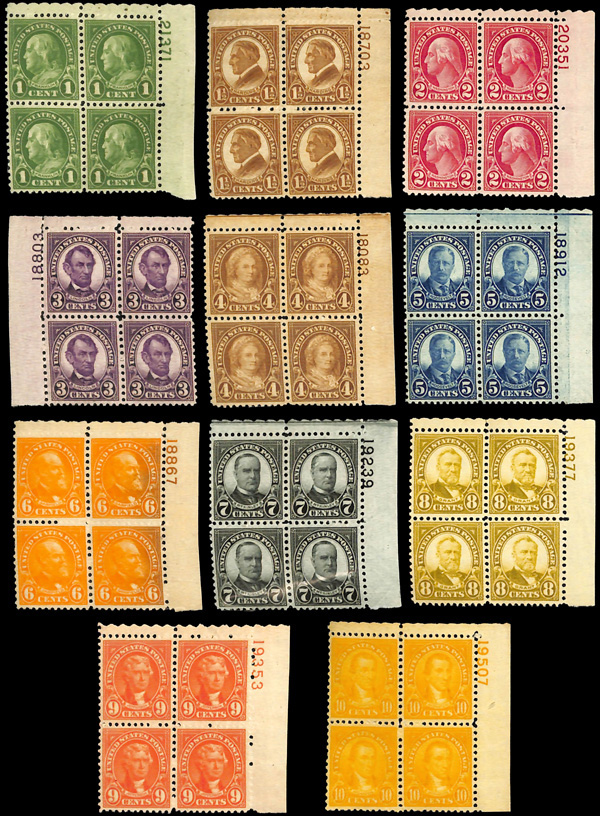 8221 nhbl 632-634, 635-642 image1926-34, Rotary press definitives, perf. 11 x 10½ 1¢ to 10¢ complete (Scott 632-634, 635-642), set of 11, plate blocks of 4, o.g., never hinged, Very Fine to Extremely Fine.