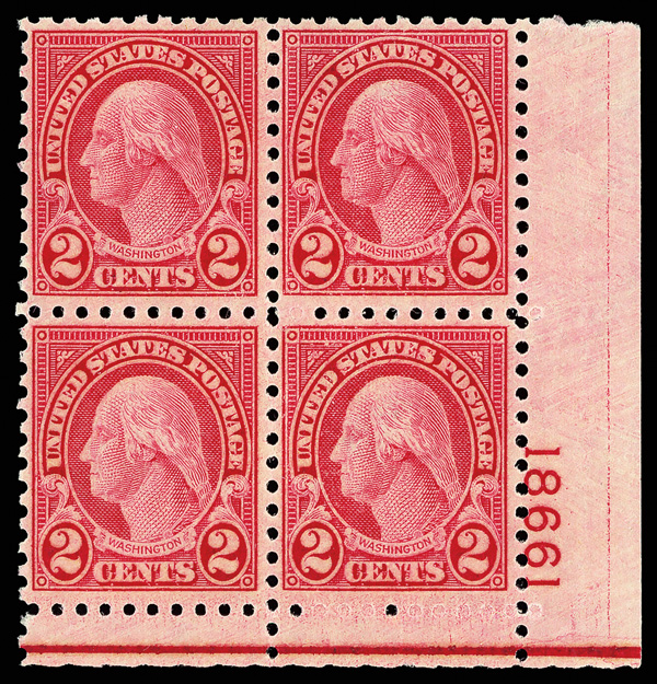 8201 nhbl 583 image1924, 2¢ Washington, rotary press printing, perf. 10 (Scott 583), bottom right plate block of 4 with plate number 18661, Brightly preserved color intensity, o.g., never hinged, Fine to Very Fine.