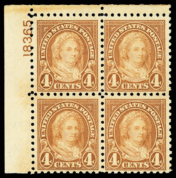 8203 nhbl 585 image1925, 4¢ Martha Washington, rotary press printing, perf. 10 (Scott 585), top left plate block of 4 with plate number 18365, Fresh printed tone, beautifully held, o.g., never hinged, Very Fine.