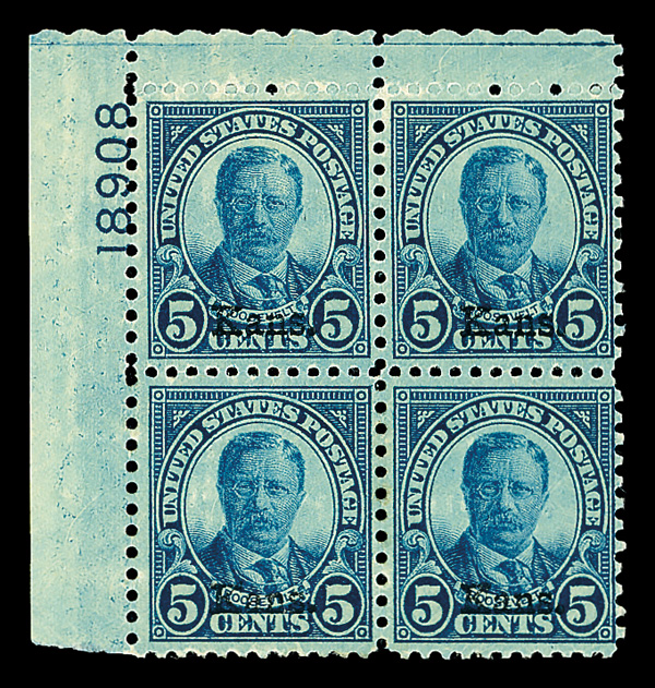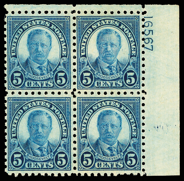 8204 nhbl 586 image1924, 5¢ Roosevelt, rotary press printing, perf. 10 (Scott 586), top right plate block of 4 with plate number 16567, Bright, finely executed hue, o.g., never hinged, Fine to Very Fine.