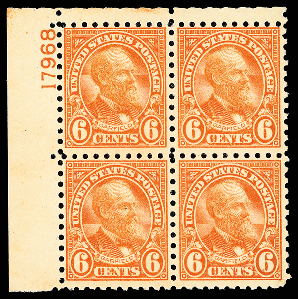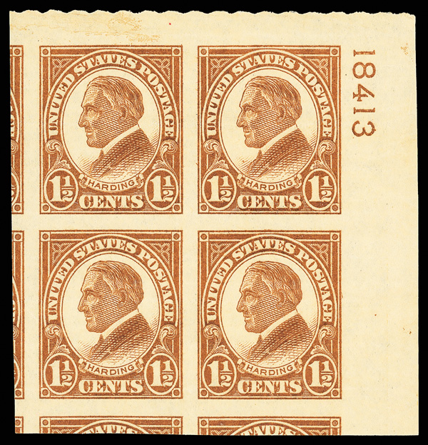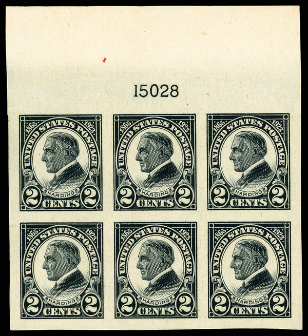 8210 nh/ogbl 611 image1923, 2¢ Harding, imperf. (Scott 611), top margin plate block of 6 with plate number 15028, Deep crisp tone with purity, o.g., bottom center stamp lightly hinged (5 stamps never hinged), Superb centering.