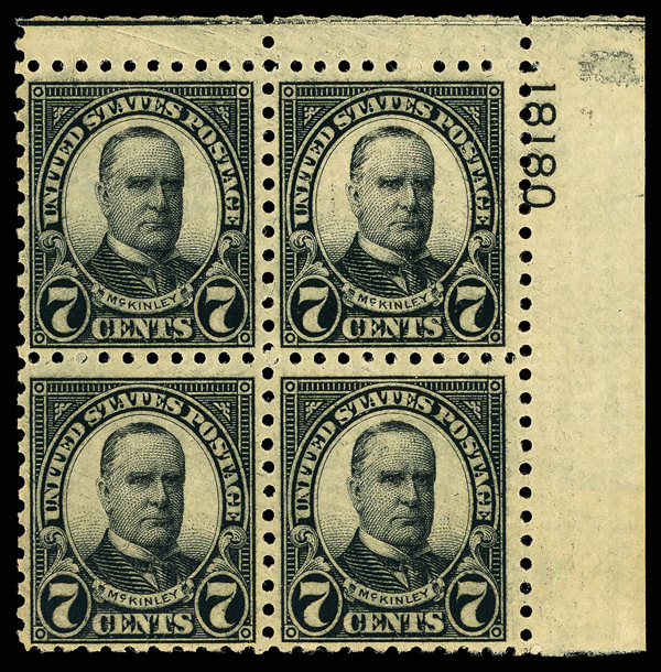 8206 nhbl 588 image1926, 7¢ McKinley, rotary press printing, perf. 10 (Scott 588), top right plate block of 4 with plate number 18180, Vibrant depth with crisp edges, o.g., never hinged; small gum skips, Fine.