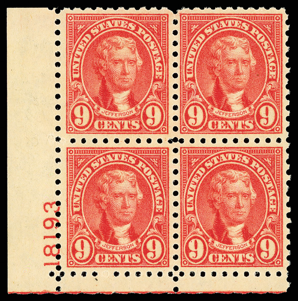 8207 nhbl 590 image1926, 9¢ Jefferson, rotary press printing, perf. 10 (Scott 590), bottom left plate block of 4 with plate number 18193, Deep lively color presence, o.g., never hinged, Very Fine.