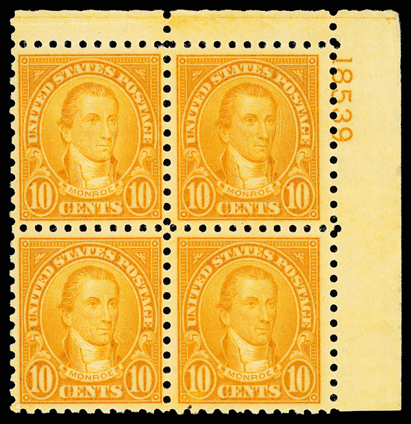 8209 nhbl 591 image1925, 10¢ Monroe, rotary press printing, perf. 10 (Scott 591), top right plate block of 4 with plate number 18539, Fresh clarity in every detail, right stamps have beautiful centering, o.g., never hinged; tiny inclusion on lower right stamp, Very Fine.