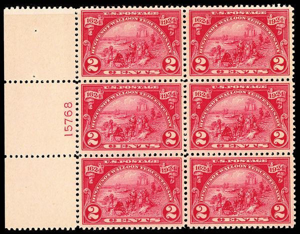 8212 ogbl 615 image1924, 2¢ Huguenot-Walloon (Scott 615), wide left margin plate block of 6 with plate number 15768, Bright, sharp color impression, o.g., previously hinged, Fine to Very Fine.