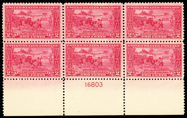 8214 nhbl 618 image1925, 2¢ Lexington-Concord (Scott 618), wide bottom margin plate block of 6 with plate number 16803, Bright rich ink impression, o.g., never hinged; short perf on lower left stamp, Very Fine.