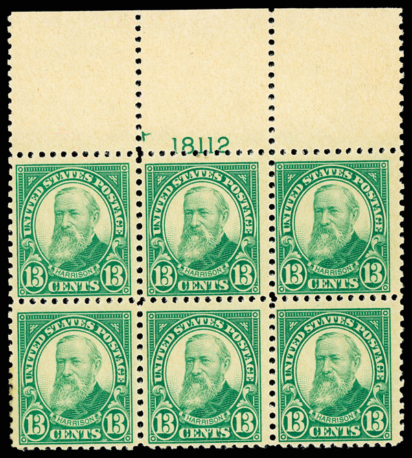 8217 nhbl 622 image1926, 13¢ Harrison (Scott 622), wide top margin plate block of 6 with plate number F 18112, Fresh bright tone with depth, o.g., never hinged, Fine to Very Fine.