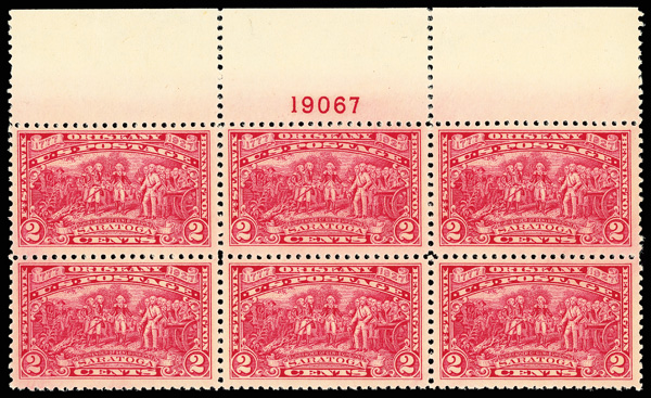 8224 nhbl 644 image1927, 2¢ Burgoyne (Scott 644), wide top margin plate block of 6 with plate number 19067, Rich lively tone preserved, o.g., never hinged, Fine to Very Fine.