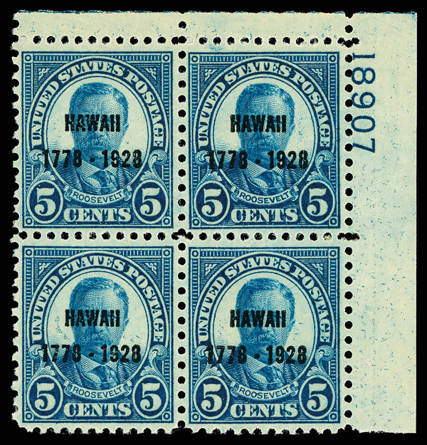8227 nh/ogbl 648 image1928, 5¢ Hawaii (Scott 648), top right plate block of 4 with plate number 18907, Fresh, radiant tone throughout, o.g., right stamps lightly hinged (2 stamps never hinged), Fine to Very Fine.