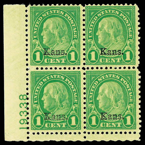 8229 nhbl 658 image1929, 1¢ Kans. (Scott 658), bottom left plate block of 4 with plate number 19338, Fresh color with a sharp, clear look, o.g., never hinged, Fine to Very Fine.