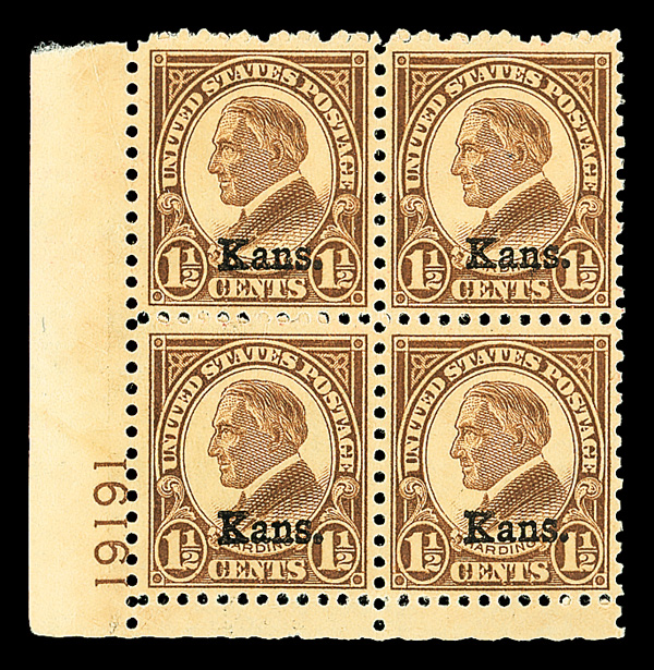 8230 nh/ogbl 659 image1929, 1½¢ Kans. (Scott 659), bottom left plate block of 4 with plate number 19191, Strong, fresh color that presents beautifully, o.g., top stamps lightly hinged (2 stamps never hinged), Very Fine.
