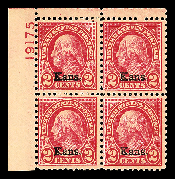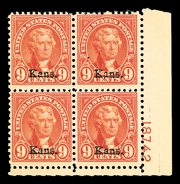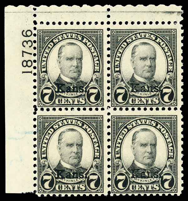 8237 nhbl 665 image1929, 7¢ Kans. (Scott 665), top left plate number 18736 block of 4, o.g., never hinged, sound and fresh with attractive color and detail, Fine to Very Fine.