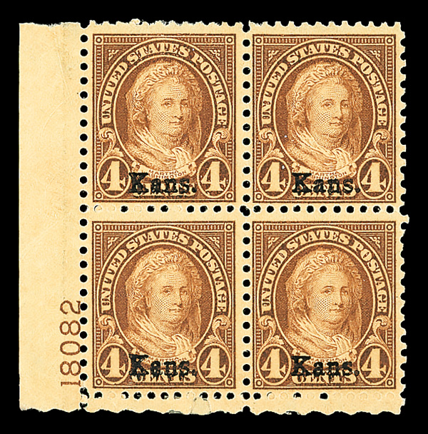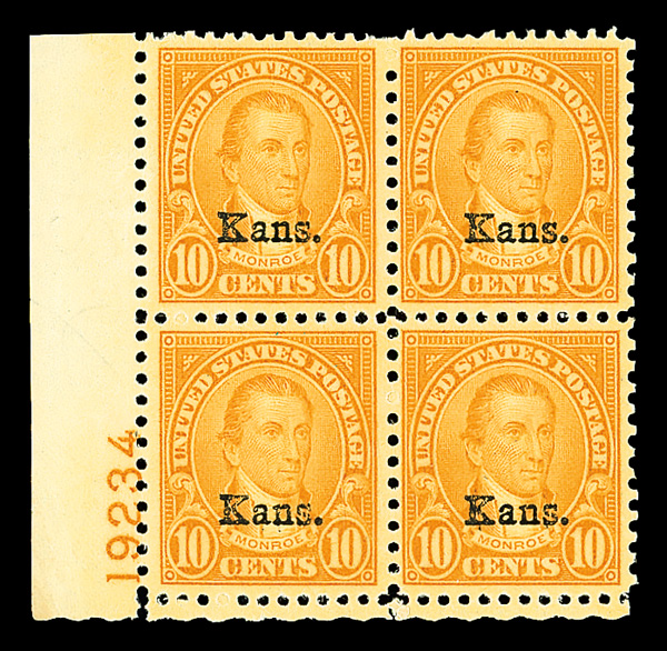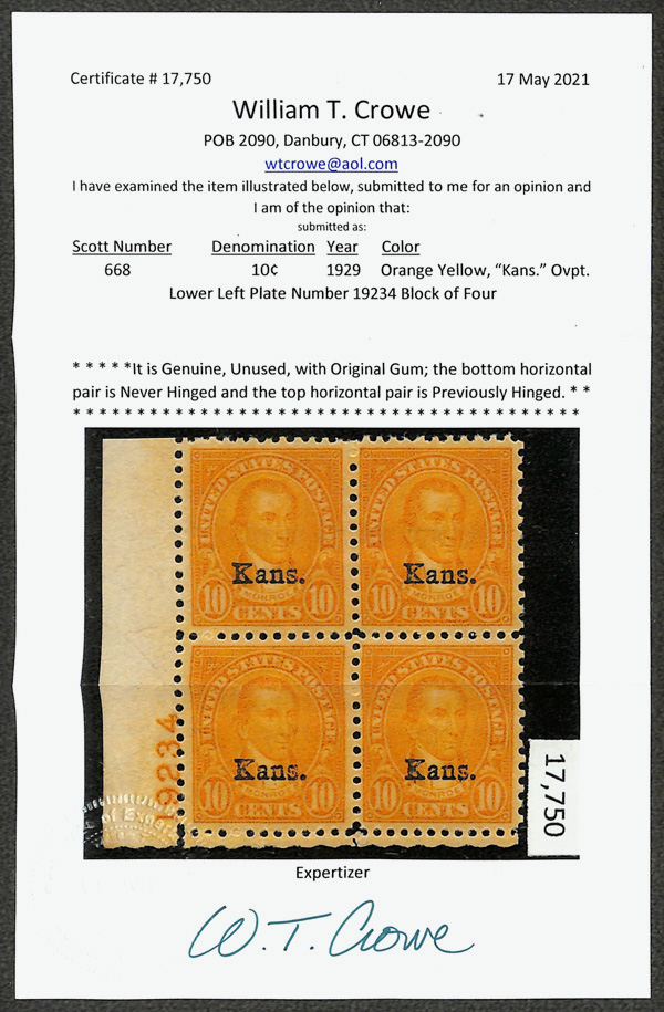 8240 nh/ogbl 668 image1929, 10¢ Kans. (Scott 668), bottom left plate block of 4 with plate number 19234, Pure, freshly bright, left stamps very well centered, o.g., top stamps lightly hinged (2 stamps never hinged); light corner bends on lower left selvage, Very Fine, with 2021 Crowe certificate.