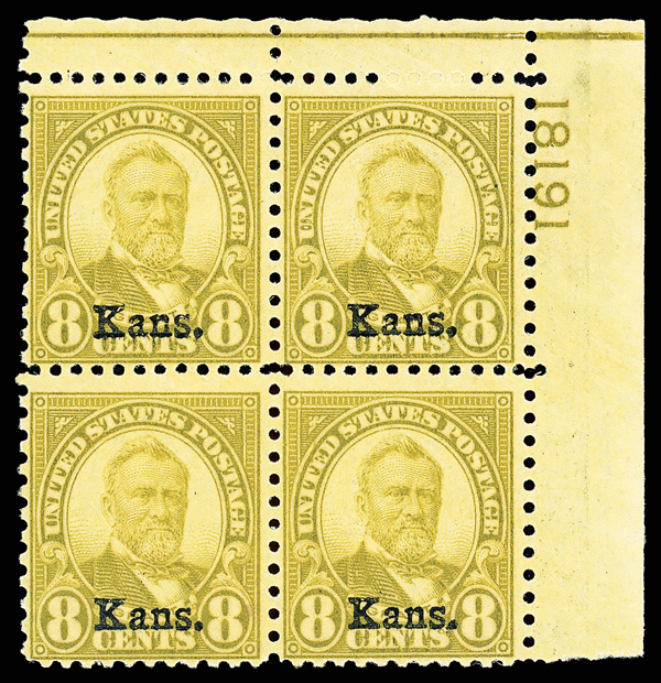 8238 nhbl 666 image1929, 8¢ Kans. (Scott 666), top right plate number 18191 block of 4, o.g., never hinged, sound and fresh with robust color, Fine to Very Fine.
