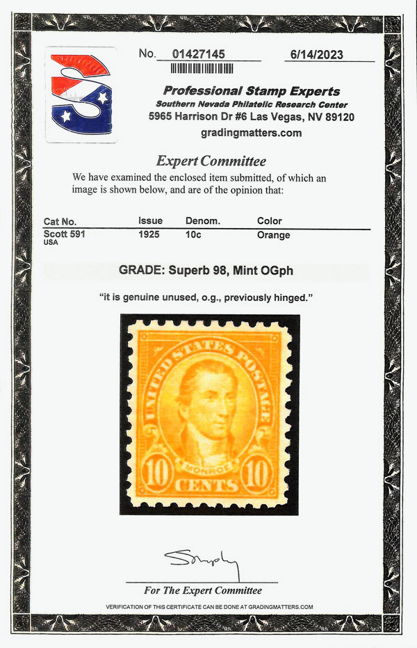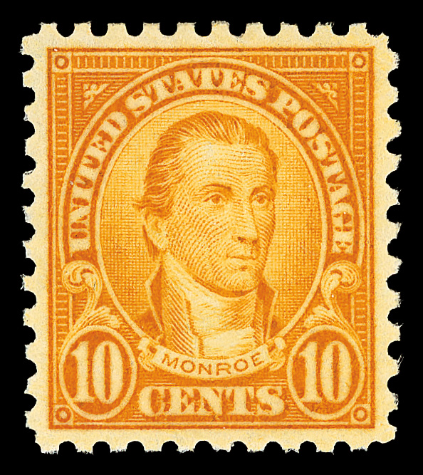 8208 og 591 image1925, 10¢ Monroe, rotary press printing, perf. 10 (Scott 591), o.g., barest trace of hinge, a beautiful stamp with radiant color and exceptional centering, Superb, Only 5 other hinged examples have achieved the grade of 98 and none have exceeded it, with 2023 P.S.E. certificate graded SUP 98.