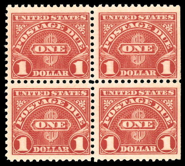 8347 nhbl J77a imagePostage Due, 1930, $1 scarlet (Scott J77a), right margin block of 4 with natural straight edge, o.g., never hinged (gum skips and bends), Fine.