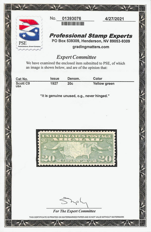 8321 nh C9 imageAirmail, 1927, 20¢ Map & Planes (Scott C9), o.g., never hinged, Extremely Fine to Superb, with 2021 P.S.E. certificate.