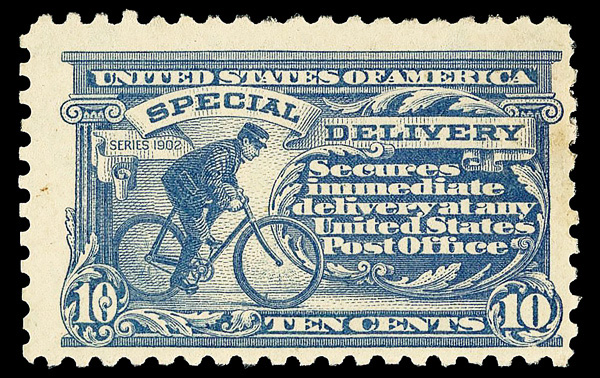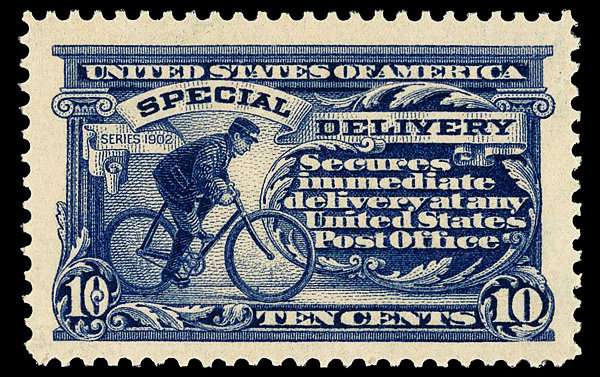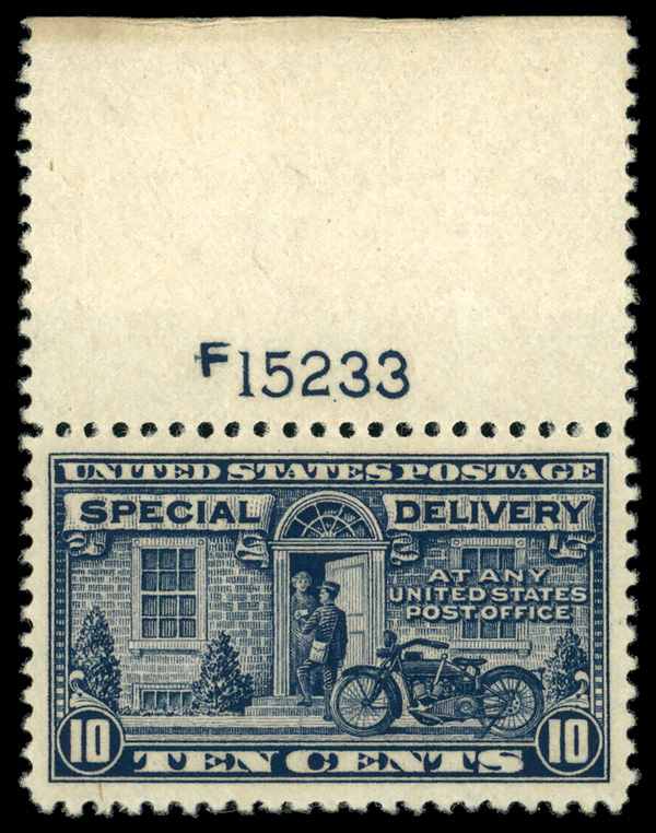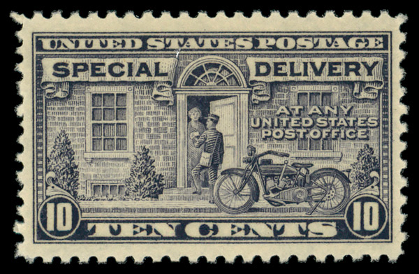8334 nh E12a imageSpecial Delivery, 1922, 10¢ deep ultramarine (Scott E12a), plate number single, o.g., never hinged, Extremely Fine. (Image) Suggested Bid $145