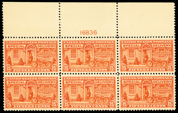 8336 nhbl E13 imageSpecial Delivery, 1925, 15¢ deep orange (Scott E13), top margin plate block of 6, Lovely glowing tone, o.g., never hinged, Very Fine.