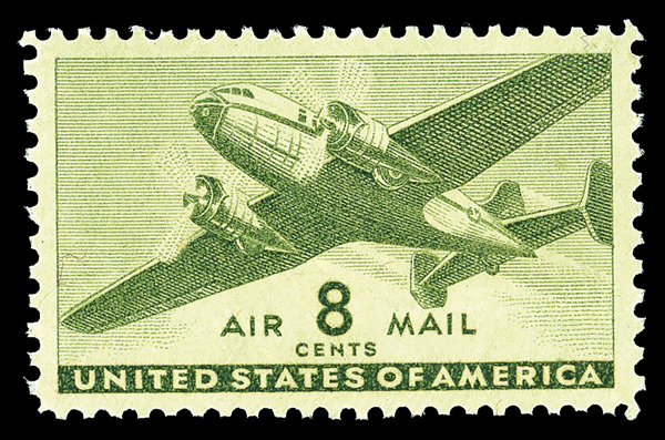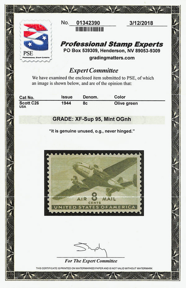 8327 nh C26 imageAirmail, 1944, 8¢ Transport (Scott C26), single, o.g., never hinged, Extremely Fine to Superb, with 2018 P.S.E. certificate graded XF-SUP 95.