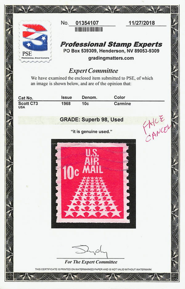 8328 O C73 imageAirmail, 1968, 10¢ Fifty-Star Runway coil (Scott C73), single; Possible fake cancel., Superb. (Image) (Image2) (All Images)