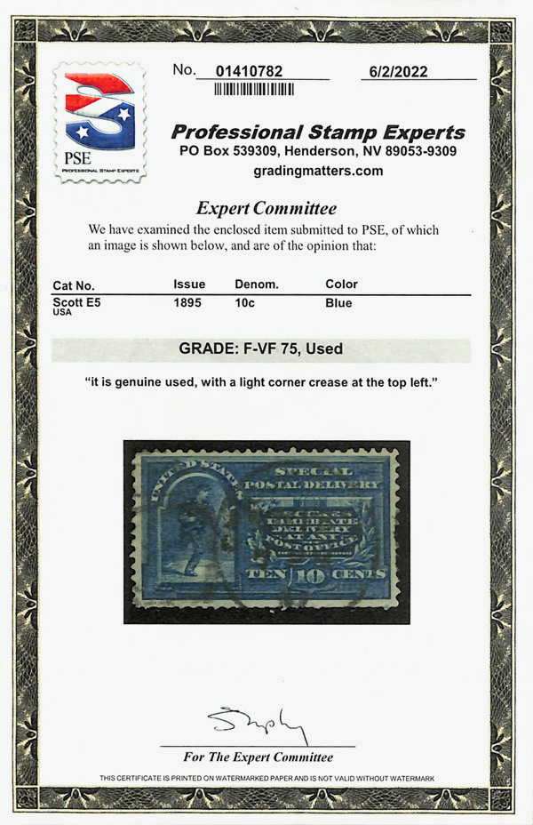 8329 O E5 imageSpecial Delivery, 1895, 10¢ blue (Scott E5), single, Fine to Very Fine, with 2022 P.S.E. certificate graded F-VF 75.