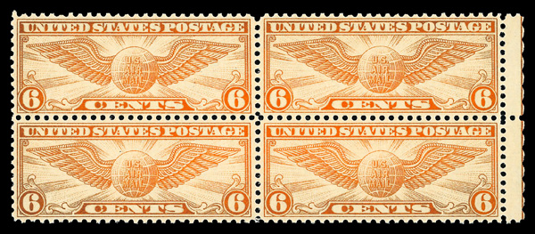 8326 nhbl C19 imageAirmail, 1934, 6¢ Winged Globe (Scott C19), right margin block of 4, o.g., never hinged, sound with perforations intact and superior centering throughout, Very Fine to Extremely Fine. (Image) Suggested Bid $48