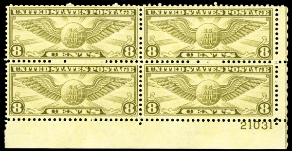 8323 nhbl C17 imageAirmail, 1932, 8¢ Winged Globe (Scott C17), plate block of 4, o.g., never hinged, Very Fine to Extremely Fine.