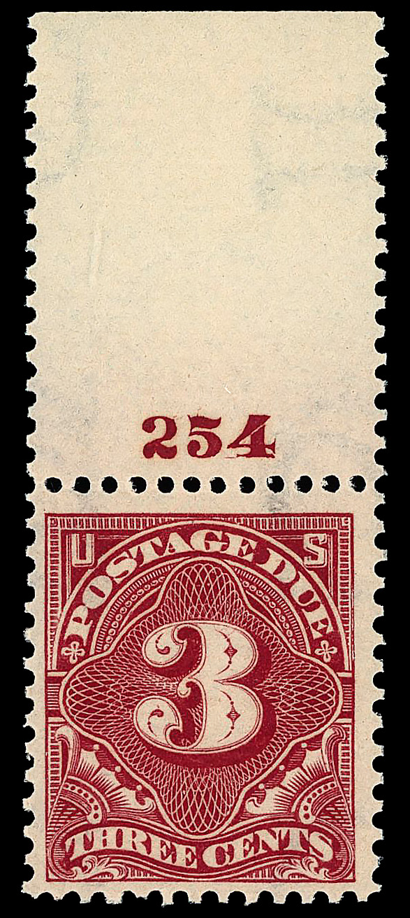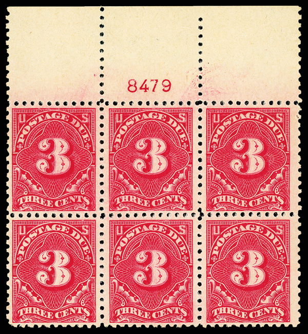 8345 ogbl J63 imagePostage Due, 1917, 3¢ carmine rose, unwatermarked, perf. 11 (Scott J63), top margin plate block of 6 with plate number 8479, Bright, crisp condition, o.g., previously hinged, Fine to Very Fine.